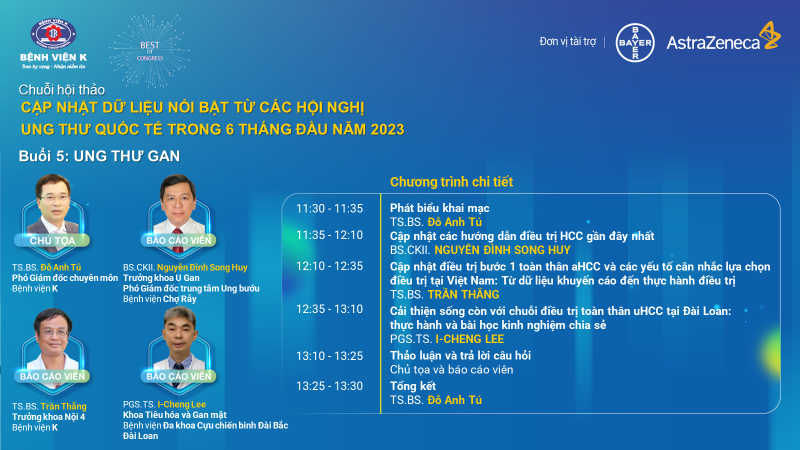 Nằm trong chương trình chuỗi hội thảo khoa học “Cập nhật dữ liệu nổi bật từ hội nghị ung thư quốc tế 6 tháng đầu năm” thực hiện bởi Viện Ung thư quốc gia - Bệnh viện K với sự tài trợ của Công ty TNHH AstraZeneca Việt Nam và Công ty Bayer Việt Nam, buổi 5: Ung thư gan đã thu hút sự theo dõi của gần 200 Quý bác sĩ trên toàn quốc.