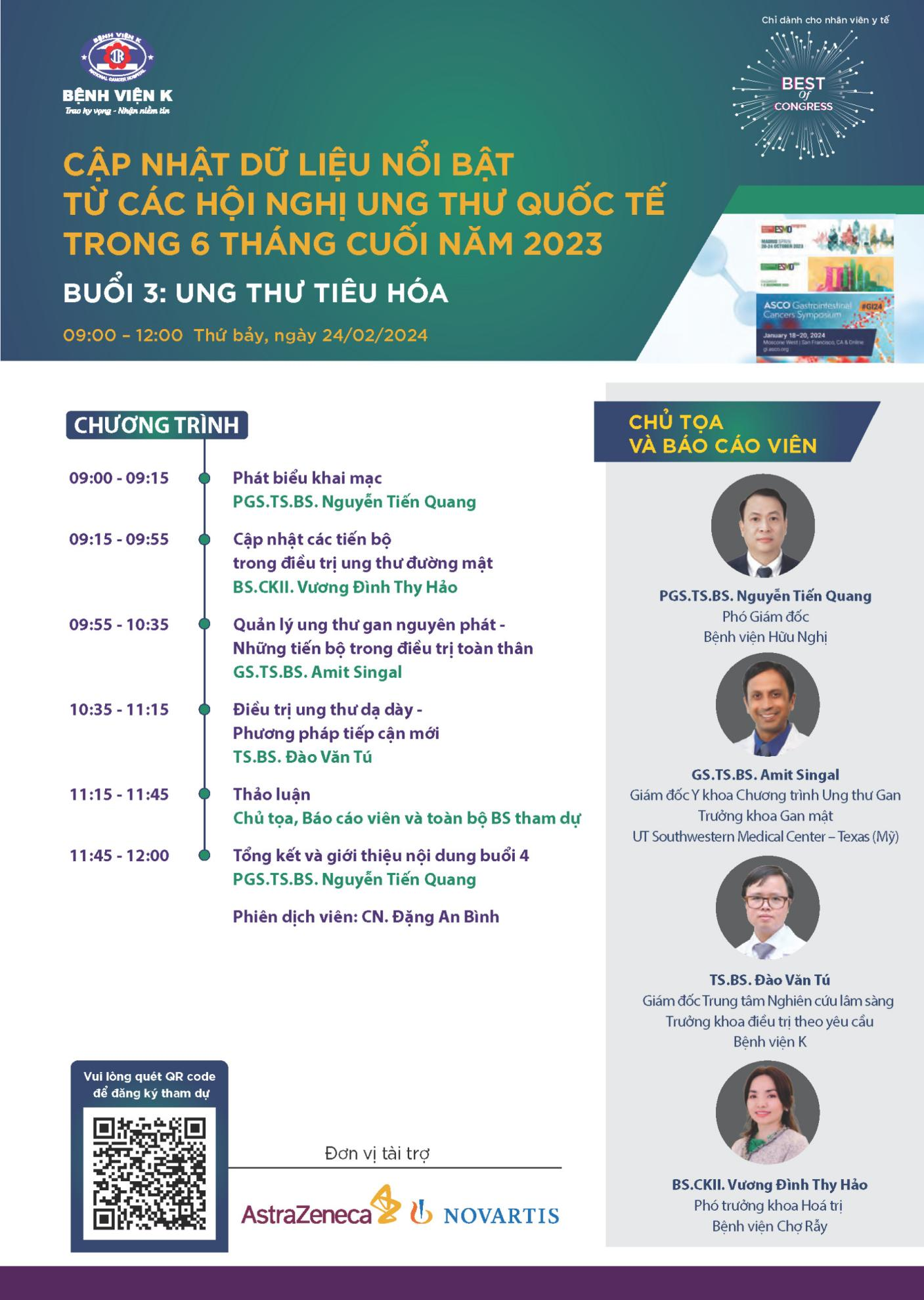 Kính mời Quý Bác sĩ, Dược sĩ tham dự buổi 3 của chuỗi chương trình “Cập nhật dữ liệu nổi bật từ các hội nghị ung thư quốc tế trong 6 tháng cuối năm 2023” vào lúc 09:00 – 12:00, thứ bảy ngày 24/02/2024, với chủ đề: Ung thư đường tiêu hóa - gan mật