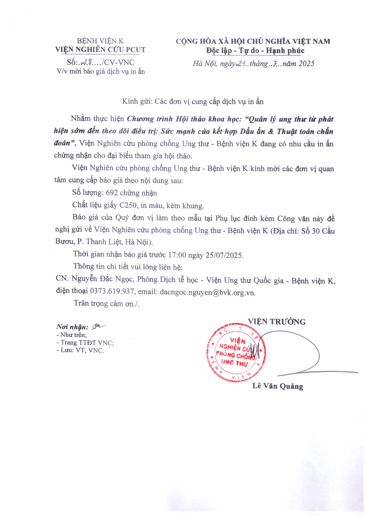 Nhằm thực hiện Chương trình hội thảo khoa học Quản lý ung thư từ phát hiện sớm đến theo dõi điều trị: Sức mạnh của kết hợp Dấu ấn & Thuật toán chẩn đoán”, Viện Nghiên cứu phòng chống Ung thư - Bệnh viện K đang có nhu cầu in ấn chứng nhận cho học viên tham gia chuỗi chương trình đào tạo.