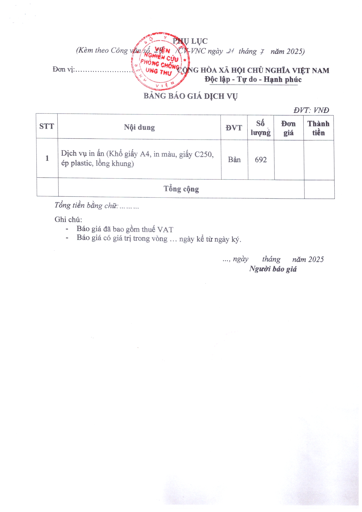 Kính gửi: Các đơn vị cung cấp dịch vụ in ấn